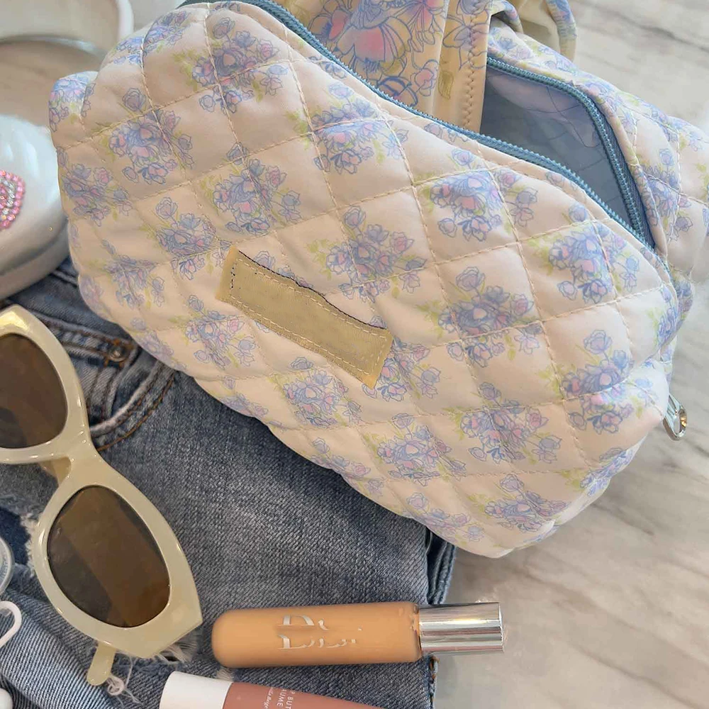 Print Small Cute Quilted Flower Floral Travel Cosmetic Bag for Women Soft Cotton Toiletry Organizer Makeup Pouch