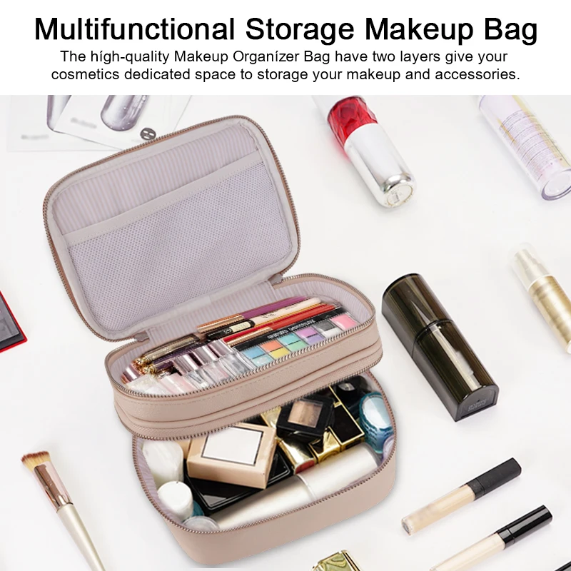 Professional Medium Capacity Waterproof Soft Handle Portable Cosmetic Case Pouch Zipper Closure PU Travel Makeup Bag for Brushes